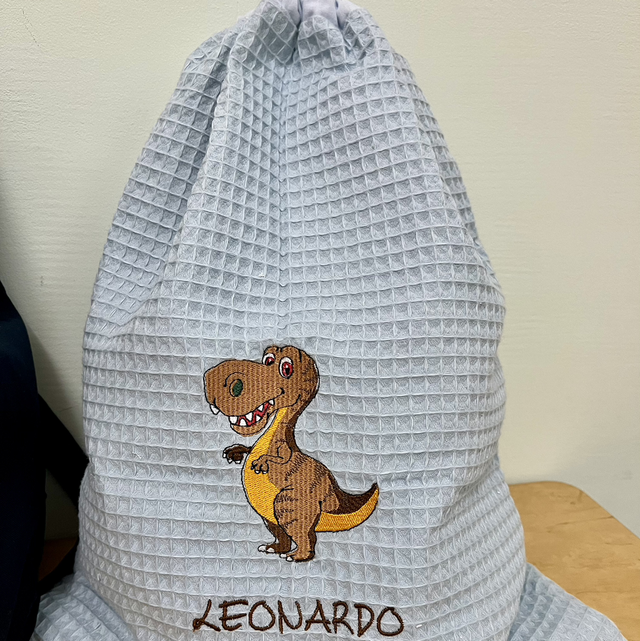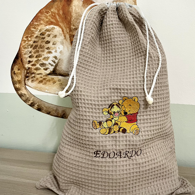 Sacca asilo in cotone nido d’ape personalizzabile con disegno ricamato e nome. Diverse colorazioni disponibili.
